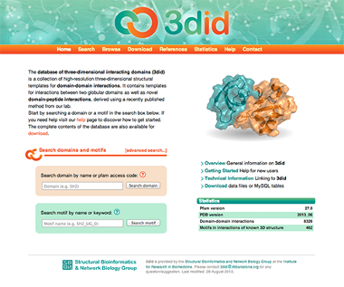 The database of three-dimensional (3D) interacting domains (3did, available online for browsing and bulk download at http://3did.irbbarcelona.org) is a catalogue of protein-protein interactions for which a high-resolution 3D structure is known. 3did collects and classifies all structural templates of domain-domain interactions in the Protein Data Bank, providing molecular details for such interactions. The current version also includes a pipeline for the discovery and annotation of novel domain-motif interactions. For every interaction, 3did identifies and groups different binding modes by clustering similar interfaces into “interaction topologies”. By maintaining a constantly updated collection of domain-based structural interaction templates, 3did is a reference source of information for the structural characterization of protein interaction networks. 3did is updated every six months.