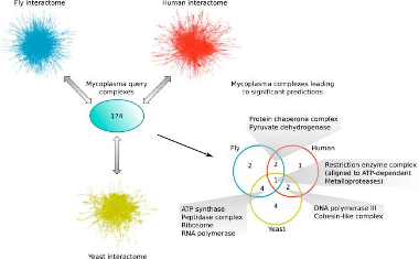 Pache R, Aloy P, Macromolecular assemblies play an important role in almost all cellular processes. However, despite several large-scale studies, our current knowledge about protein complexes is still quite limited, thus advocating the use of in silico predictions to gather information on complex composition in model organisms. Since protein–protein interactions present certain constraints on the functional divergence of macromolecular assemblies during evolution, it is possible to predict complexes based on orthology data. Here, we show that incorporating interaction information through network alignment significantly increases the precision of orthology-based complex prediction. Moreover, we performed a large-scale in silico screen for protein complexes in human, yeast and fly, through the alignment of hundreds of known complexes to whole organism interactomes. Systematic comparison of the resulting network alignments to all complexes currently known in those species revealed many conserved complexes, as well as several novel complex components. In addition to validating our predictions using orthogonal data, we were able to assign specific functional roles to the predicted complexes. In several cases, the incorporation of interaction data through network alignment allowed to distinguish real complex components from other orthologous proteins. Our analyses indicate that current knowledge of yeast protein complexes exceeds that in other organisms and that predicting complexes in fly based on human and yeast data is complementary rather than redundant. Lastly, assessing the conservation of protein complexes of the human pathogen Mycoplasma pneumoniae, we discovered that its complexes repertoire is different from that of eukaryotes, suggesting new points of therapeutic intervention, whereas targeting the pathogen’s Restriction enzyme complex might lead to adverse effects due to its similarity to ATP-dependent metalloproteases in the human host.