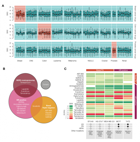 Jaeger S, Duran-Frigola M, Aloy P, Cancer cell lines play key roles in the initial stages of drug discovery, facilitating the high-throughput screening of potential drugs. Here, we assess whether drug sensitivity in cancer cell lines is able to discriminate tissue specificity. We find that cancer-specific drugs do not show higher efficacies in cell lines representing the respective tissues. Even when considering distinct cancer subtypes and targeted therapies, most drugs are evenly effective/ineffective throughout all cell lines.