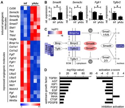 Schlereth K, Weichenhan D, Bauer T, Heumann T, Giannakouri E, Lipka D, Jaeger S, Schlesner M, Aloy P, Eils R, Plass C Augustin HG, Maintenance of a quiescent and organotypically-differentiated layer of blood vessel-lining endothelial cells (EC) is vital for human health. Yet, the molecular mechanisms of vascular quiescence remain largely elusive. Here we identify the genome-wide transcriptomic program controlling the acquisition of quiescence by comparing lung EC of infant and adult mice, revealing a prominent regulation of TGFß family members. These transcriptomic changes are distinctly accompanied by epigenetic modifications, measured at single CpG resolution. Gain of DNA methylation affects developmental pathways, including NOTCH signaling. Conversely, loss of DNA methylation preferentially occurs in intragenic clusters affecting intronic enhancer regions of genes involved in TGFβ family signaling. Functional experiments prototypically validated the strongly epigenetically regulated inhibitors of TGFβ family signaling SMAD6 and SMAD7 as regulators of EC quiescence. These data establish the transcriptional and epigenetic landscape of vascular quiescence that will serve as a foundation for further mechanistic studies of vascular homeostasis and disease-associated activation.
