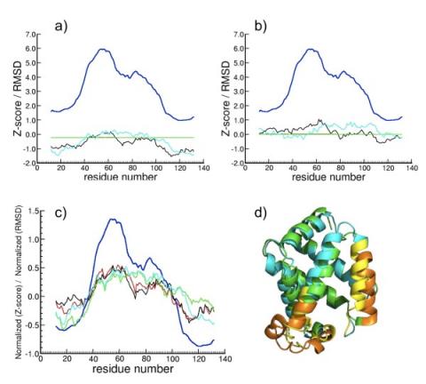 Here, we present and demonstrate a theory to split the knowledge-based potentials in scoring terms biologically meaningful and to combine them in new scores to predict near-native structures. Our strategy allows circumventing the problem of defining the reference state. In this approach we give the proof for a simple and linear application that can be further improved by optimizing the combination of Zscores. Using the simplest composite score (ZECbeta) we obtained predictions similar to state-of-the-art methods. Besides, our approach has the advantage of identifying the most relevant terms involved in the stability of the protein structure. Finally, we also use the composite Zscores to assess the conformation of models and to detect local errors.