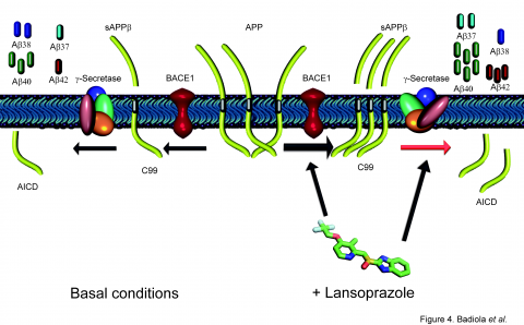 Badiola N, Alcalde V, Pujol A, Münter LM, Multhaup G, Lleó A, Coma M, Soler-López M, Aloy P, A key event in the pathogenesis of Alzheimer’s disease (AD) is the accumulation of amyloid-β (Aβ) species in the brain, derived from the sequential cleavage of the amyloid precursor protein (APP) by β- and γ-secretases. Based on a systems biology study to repurpose drugs for AD, we explore the effect of lansoprazole, and other proton-pump inhibitors (PPIs), on Aβ production in AD cellular and animal models. We found that lansoprazole enhances Aβ37, Aβ40 and Aβ42 production and lowers Aβ38 levels on amyloid cell models. Interestingly, acute lansoprazole treatment in wild type and AD transgenic mice promoted higher Aβ40 levels in brain, indicating that lansoprazole may also exacerbate Aβ production in vivo. Overall, our data presents for the first time that PPIs can affect amyloid metabolism, both in vitro and in vivo.
